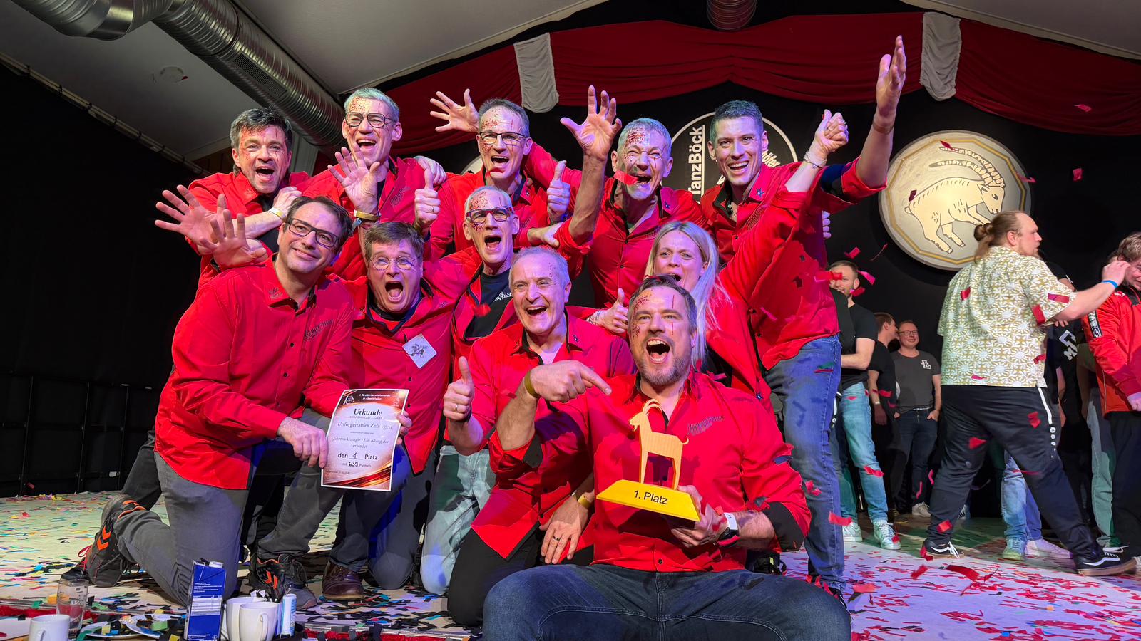 Beinahe zeitgleich zu den Turedancern herrschte am Samstag dann auch bei den Unforgettables ausgelassener Jubel. Bei ihrem 2. Turnier an diesem Wochenende in Albertshofen gelang schließlich der Sprung nach ganz oben. Sie holten sich den 1. Platz (639 Punkte) und verwies dabei das Männerballett aus Ochsenfurt (632 Punkte) und aus Laub (556 Punkte) auf die Plätze zwei und drei.